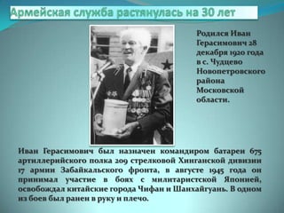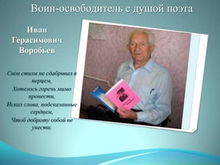 Иван Герасимович Воробьев, родившийся 28 декабря 1920 года, был командиром батареи во время Второй мировой войны и участвовал в освобождении китайских городов от японских войск. Он также стал одним из основателей вольнянского краеведческого музея и инициатором установки памятников, а также опубликовал 25 поэтических сборников. В 1985 году ему было присвоено звание 'почетный член украинского общества охраны памятников истории и культуры', а недавно он получил звание 'почетный ветеран Украины'.