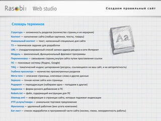 Документ представляет собой семинар по созданию и продвижению сайтов, определяющий ключевые термины, этапы разработки, а также рекомендации по выбору исполнителей. Он включает советы по наполнению сайтов, рекламе и эффективному SEO-продвижению, а также предостережения о возможных ошибках при создании и продвижении. Основное внимание уделяется формированию уникального контента и правильной структуре сайта для успешного функционирования в сети.
