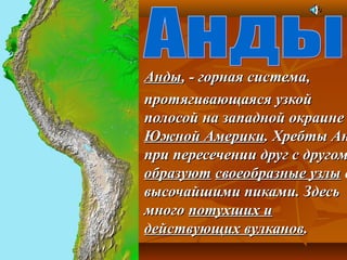 Анды – самая длинная и высокая горная система на Земле, протянувшаяся на 9000 км вдоль западной окраины Южной Америки. Они служат важным климатическим барьером, разделяющим воздействие Атлантического и Тихого океанов, и являются местом обитания множества видов флоры и фауны. Разнообразие природных ресурсов, включая полезные ископаемые и уникальные экосистемы, делает Анд важной областью для горнодобывающей промышленности.