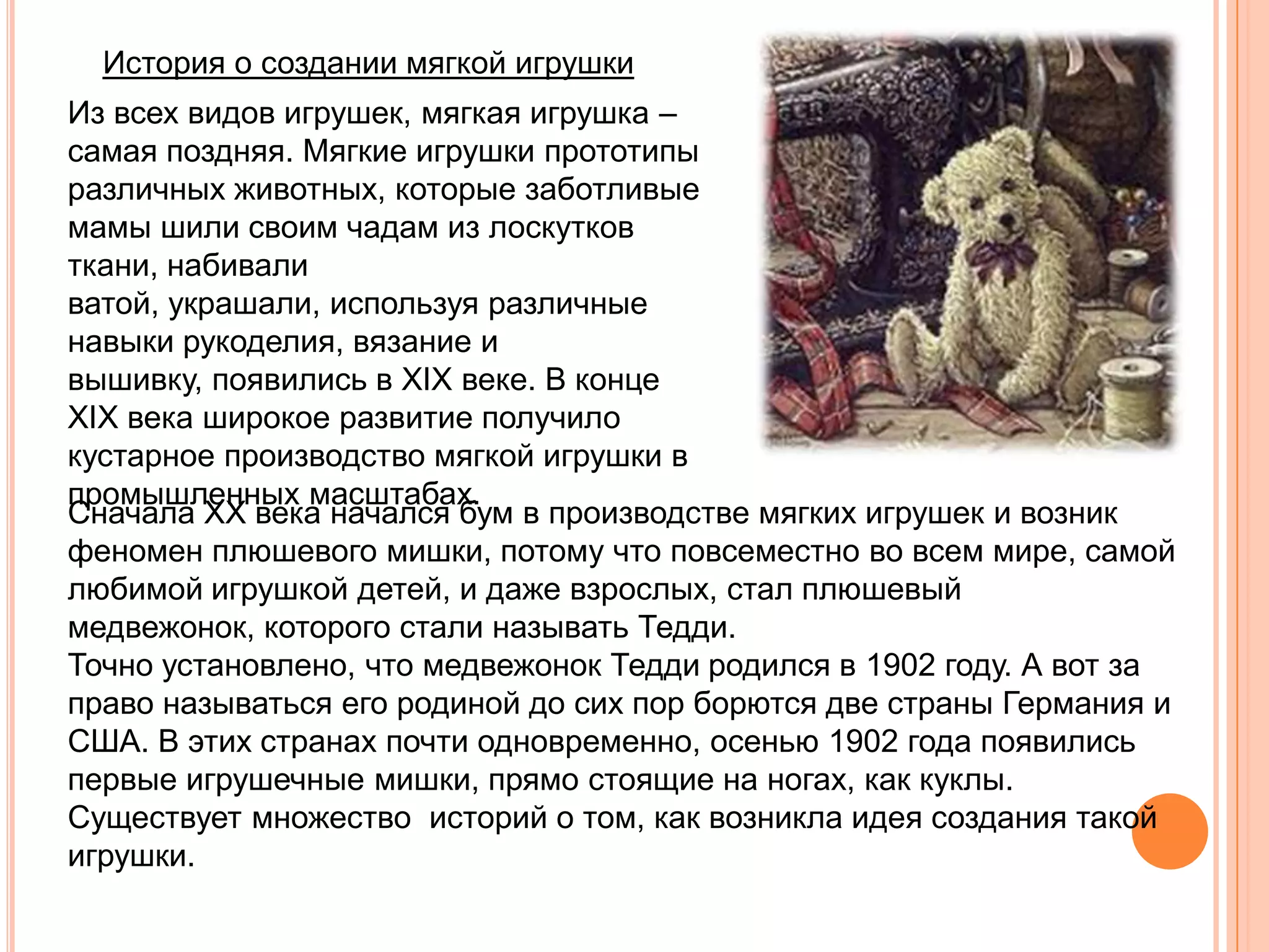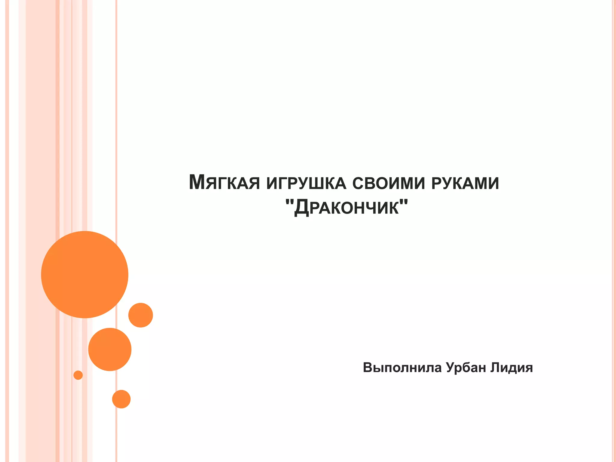 Документ описывает процесс создания мягкой игрушки в виде дракончика, включая исторические контексты и инструменты, используемые для ее изготовления. В нем упоминается о развитии мягких игрушек с конца XIX века и феномене плюшевого медвежонка Тедди. Подробно описаны этапы работы, начиная от выкройки и заканчивая сборкой и оформлением игрушки.