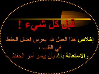 يتناول المستند وسائل مساعدة لحفظ القرآن الكريم، مشيرًا إلى أهمية العزيمة والتكرار والمثابرة. كما يوصي بالتعاون مع معلم أو رفيق في الحفظ وتطبيق أساليب متنوعة لمراجعة وتثبيت المعلومات. بالإضافة إلى ذلك، يشدد على أهمية التجويد وفهم الآيات من خلال التفسير والسياق.
