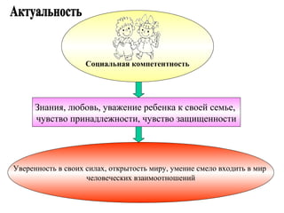 Документ описывает проект, посвященный социально-нравственному развитию детей дошкольного возраста через ознакомление с семьей. Основная цель проекта заключается в обосновании необходимости целенаправленной работы по воспитанию знаний о семье, что способствует улучшению социально-нравственного развития ребенка. В проекте также определяются задачи, этапы реализации, методы работы и ожидаемые результаты в оценке знаний детей о значении семьи.