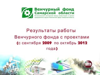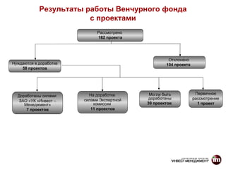 Документ содержит результаты работы венчурного фонда с 2009 по 2012 годы, в период которого было рассмотрено 162 проекта. Из них 104 проекта были отклонены, а 58 находятся на доработке. Документ включает подробный список названий проектов и их инициаторов.