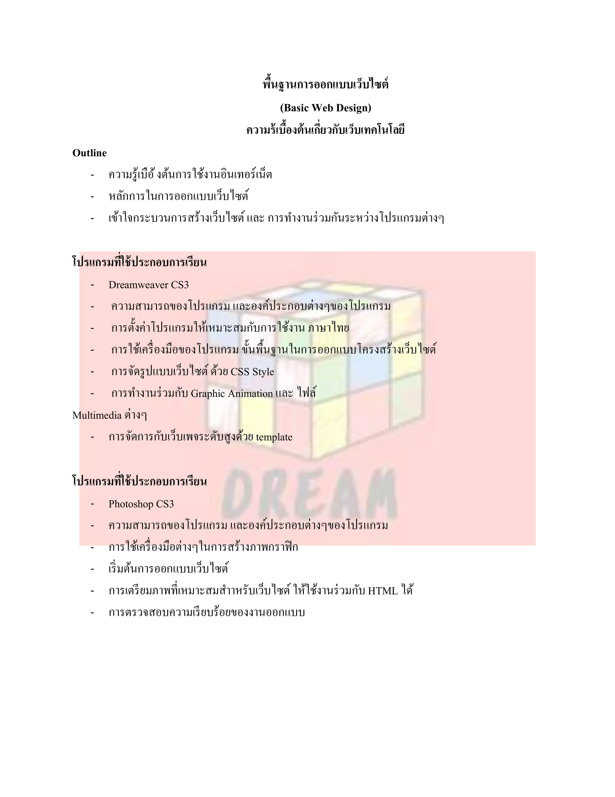 ้ (Basic Web Design) ความร้ เบืองต้นเกียวกับเว็บเทคโนโลยี ้ ่ Outline - ความรู้เบือ ้ งต้นการใช้งานอินเทอร์เน็ต - หลักการในการออกแบบเว็บไซต์ - เข้าใจกระบวนการสร้างเว็บไซต์ และ การทางานร่ วมกันระหว่างโปรแกรมต่างๆ โปรแกรมทีใช้ ประกอบการเรียน ่ - Dreamweaver CS3 - ความสามารถของโปรแกรม และองค์ประกอบต่างๆของโปรแกรม - การตั้งค่าโปรแกรมให้เหมาะสมกับการใช้งาน ภาษาไทย - การใช้เครื่ องมือของโปรแกรม ขั้นพื้นฐานในการออกแบบโครงสร้างเว็บไซต์ - การจัดรู ปแบบเว็บไซต์ ด้วย CSS Style - การทางานร่ วมกับ Graphic Animation และ ไฟล์ Multimedia ต่างๆ - การจัดการกับเว็บเพจระดับสูงด้วย template โปรแกรมทีใช้ ประกอบการเรียน ่ - Photoshop CS3 - ความสามารถของโปรแกรม และองค์ประกอบต่างๆของโปรแกรม - การใช้เครื่ องมือต่างๆในการสร้างภาพกราฟิ ก - เริ่ มต้นการออกแบบเว็บไซต์ - การเตรี ยมภาพที่เหมาะสมสาาหรับเว็บไซต์ ให้ใช้งานร่ วมกับ HTML ได้ - การตรวจสอบความเรี ยบร้อยของงานออกแบบ
