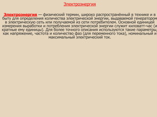 Документ описывает электроэнергию как важный ресурс, используемый в быту и промышленности, с подробной информацией о методах генерации и передачи. Он подчеркивает необходимость более эффективного использования электроэнергии и предлагает способы снижения потребления, такие как использование энергосберегающих технологий. Также рассматриваются экологические аспекты и тенденции в производстве электроэнергии.