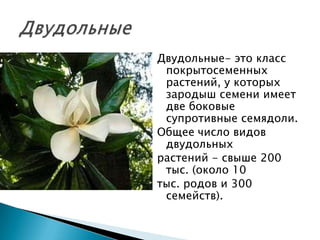 Документ описывает двудольные растения, их строение, классы и значение в сельском хозяйстве. Упоминаются различные семейства двудольных, включая крестоцветные, паслёновые, бобовые и розоцветные, с акцентом на их разнообразие и экономическую важность. Презентацию о двудольных растениях подготовила ученица 7 класса из школы №6.