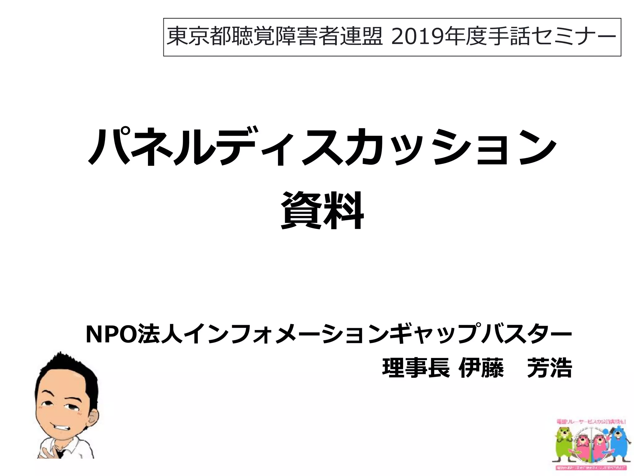 パネルディスカッション 資料 NPO法⼈インフォメーションギャップバスター 理事⻑ 伊藤 芳浩 東京都聴覚障害者連盟 2019年度⼿話セミナー