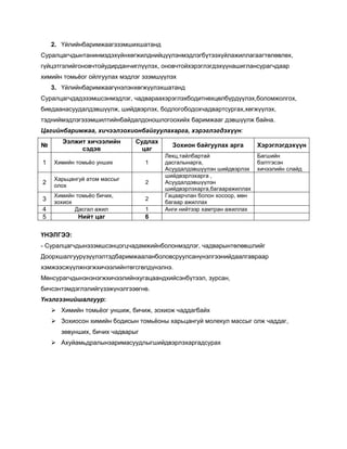 2. Үйлийнбаримжаагэзэмшихшатанд Суралцагчдынтанинмэдэхүйнхөгжилднийцүүлэнмэдлэгбүтээхүйлажиллагаагтөлөвлөх, гүйцэтгэлийгоновчтойудирданчиглүүлэх, оновчтойхэрэглэгдэхүүнашиглансурагчдаар химийн