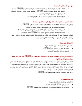 يتحدث المستند عن مفهوم المستشار المعتمد في نموذج التميز المؤسسي efqm، ويصف متطلبات أن يصبح مستشارًا معتمدًا, بما في ذلك التدريب والخبرة وتقديم التوصيات. يتم توضيح كيفية الحفاظ على الرخصة ومتطلبات مراجعتها سنويًا، بالإضافة إلى ما سيحصل عليه المستشار عند قبول طلبه. يحتوي أيضًا على معلومات حول النقاط المكتسبة وشروط المشاركة للحصول على النقاط والمكافآت.