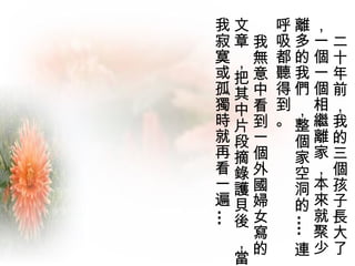 二十年前,我的三個孩子長大了,一個一個相繼離家,本來就聚少離多的我們 ,整個家空洞的 ....
