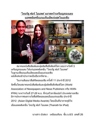 Thairath, a Thai newspaper, won three awards at the 2012 Asian Digital Media Awards for their iPad application Thairath for iPad, including the Gold award for Best Tablet Publication. The awards were presented at the 2012 World Newspaper Congress organized by the World Association of Newspapers and News Publishers from June 27-29 in Bangkok, Thailand, where over 18,000 delegates from more than 110 countries participated. Thairath for iPad allows readers to access the latest news and content from Thairath across multiple platforms like iPad, iPhone and Android devices.