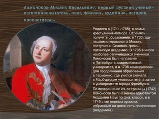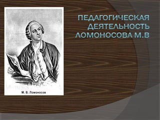 Михаил Васильевич Ломоносов (1711-1765) был первым русским ученым-естествоиспытателем, поэтом и просветителем, который оказал значительное влияние на развитие науки и образования в России. Он стал основателем Московского университета, разработал учебные пособия на русском языке и ввел новые методы преподавания. Ломоносов подчеркивал важность индивидуального подхода к обучению и соединения общего и профессионального образования для всенародного просвещения.