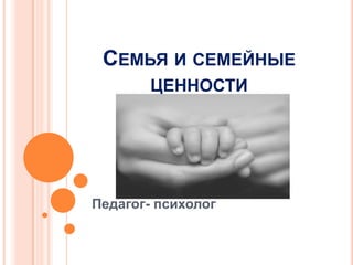 Документ рассматривает важность семьи и семейных ценностей, описывая цели и задачи семейного воспитания, такие как гармоническое развитие ребенка и забота о его здоровье. Он также анализирует функции семьи, психологический климат и динамику отношений между родителями и детьми, подчеркивая необходимость взаимной информированности и уважения. Взаимопонимание в семье рассматривается как ключевой аспект для формирования личности детей и сохранения положительной атмосферы.