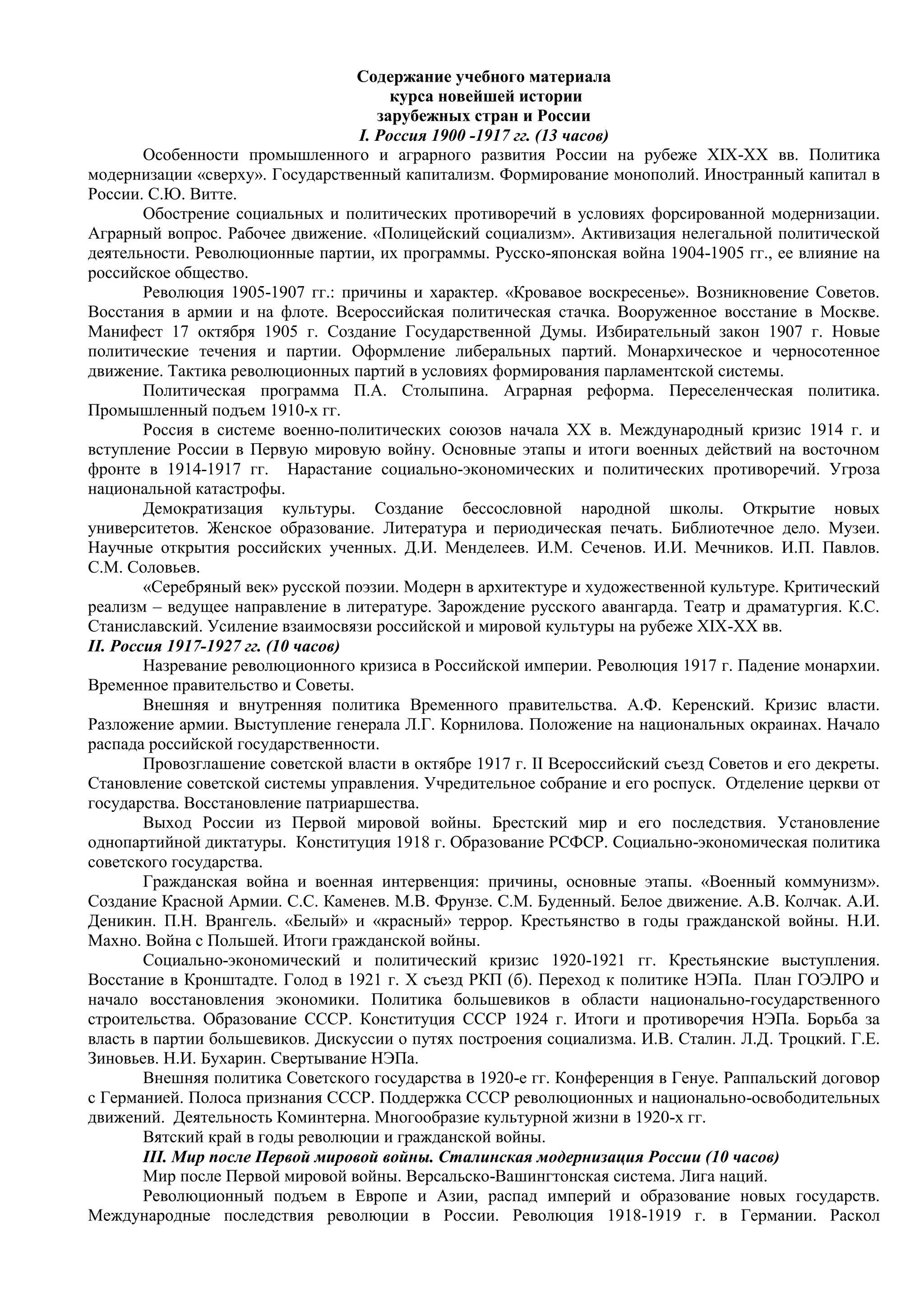 Документ представляет собой учебный материал курса по новейшей истории зарубежных стран и России, охватывающий ключевые события и процессы с 1900 по 1991 год. Он включает в себя анализ аграрного и промышленного развития России, революции, гражданской войны, сталинской модернизации, а также кризисов и реформ в позднем СССР. Исследуется влияние международных отношений и внутренней политики на формирование современного российского общества.