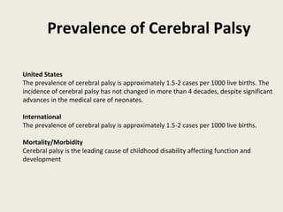 This document discusses prevalence rates for various childhood developmental, intellectual, behavioral, and learning disorders. It provides statistics on conditions such as cerebral palsy (1.5-2 per 1000 births), mild to moderate intellectual disability (1-3% of the population), autism spectrum disorders (ranging from 0.5-2.6% in different countries), and language disorders (7.4-18% in various studies). It also addresses the need for organizational changes to child development services to improve cost-efficiency and increase support for common problems through a primary care model and a proposed "Pediatric Home".