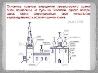 Документ освещает архитектуру, в частности, псевдорусский стиль и русско-византийский стиль храмового зодчества, основанный Константином Тоном. Описываются символические значения форм храма и куполов, а также детали конструкций и их функциональность. Особое внимание уделяется колоколам, их типам и использованию в православной церкви.