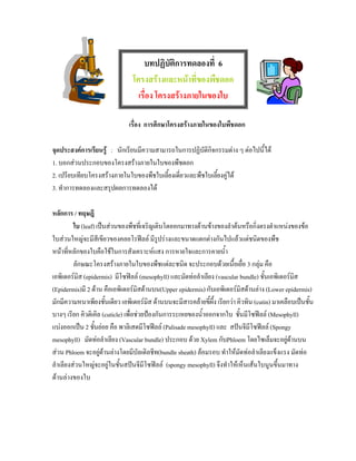 โครงสรางและหนาที่ของพืชดอก เรื่อง โครงสรางภายในของใบ เรื่อง การศึกษาโครงสรางภายในของใบพืชดอก จุดประสงคการเรียนรู : นักเรียนมีความสามารถในการปฏิบัติกิจกรรมตาง ๆ ตอไปนี้ได 1. บอกสวนประกอบของโครงสรางภายในใบของพืชดอก 2. เปรียบเทียบโครงสรางภายในใบของพืชใบเลี้ยงเดียวและพืชใบเลียงคูได ่ ้ 3. ทําการทดลองและสรุปผลการทดลองได หลักการ / ทฤษฎี ใบ (leaf) เปนสวนของพืชทีเ่ จริญเติบโตออกมาทางดานขางของลําตนหรือกิ่งตรงตําแหนงของขอ ใบสวนใหญจะมีสีเขียวของคลอโรฟลล มีรูปรางและขนาดแตกตางกันไปแลวแตชนิดของพืช หนาที่หลักของใบคือใชในการสังเคราะหแสง การหายใจและการคายน้า ํ ลักษณะโครงสรางภายในใบของพืชแตละชนิด จะประกอบดวยเนื้อเยื่อ 3 กลุม คือ เอพิเดอรมิส (epidermis) มีโซฟลล (mesophyll) และมัดทอลําเลียง (vascular bundle) ชั้นเอพิเดอรมสิ (Epidermis)มี 2 ดาน คือเอพิเดอรมิสดานบน(Upper epidermis) กับเอพิเดอรมิสดานลาง (Lower epidermis) มักมีความหนาเพียงชั้นเดียว เอพิเดอรมิส ดานบนจะมีสารคลายขี้ผึ้ง เรียกวา คิวทิน (cutin) มาเคลือบเปนชั้น บางๆ เรียก คิวติเคิล (cuticle) เพื่อชวยปองกันการระเหยของน้ําออกจากใบ ชั้นมีโซฟลล (Mesophyll) แบงออกเปน 2 ชั้นยอย คือ พาลิเสดมีโซฟลล (Palisade mesophyll) และ สปนจีมีโซฟลล (Spongy mesophyll) มัดทอลําเลียง (Vascular bundle) ประกอบ ดวย Xylem กับPhloem โดยไซเล็มจะอยูดานบน สวน Phloem จะอยูดานลางโดยมีบัลเดิลชีท(bundle sheath) ลอมรอบ ทําใหมัดทอลําเลียงแข็งแรง มัดทอ ลําเลียงสวนใหญจะอยูในชั้นสปนจีมีโซฟลล (spongy mesophyll) จึงทําใหเห็นเสนใบนูนขึ้นมาทาง ดานลางของใบ