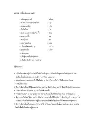 1. กลองจุลทรรศน 1 กลอง 2. สไลด และกระจกปดสไลด 2 ชุด 3. กระจกนาฬิกา 1 อัน 4. ใบมีดโกน 1 ใบ 5. พูกัน เล็ก ๆ หรือเข็มเขี่ยเชื้อ 1 ดาม 6. จานเพาะเชือ ้ 1 ชุด 7. หลอดหยด 1 อัน 8. แผนโฟมเล็กๆ 2 แผน 8. บีกเกอรขนาดตาง ๆ 1 – 2 ใบ 9. กระดาษเยื่อ 1 มวน 10. น้ําสะอาด 11. ใบพูระหง ใบผักบุง ฯลฯ 12. ใบขาว ใบขาวโพด ใบเตย ฯลฯ วิธีการทดลอง 1. ใหนกเรียนแตละกลุมนําใบไมที่เปนพืชใบเลี้ยงคูมา 1 ชนิด เชน ใบพูระหง ใบผักบุง ฯลฯ และ ั พืชใบ เลี้ยงเดี่ยว 1 ชนิด เชน ใบขาว ใบขาวโพด ใบเตย ฯลฯ 2. สังเกตลักษณะภายนอกของใบไมชนิดตาง ๆ จํานวนใบบนกานใบ บันทึกผลการสังเกต (วาดรูปประกอบ) 3. สําหรับพืชใบเลี้ยงคู ใหมวนจากริมใบดานหนึ่งมายังริมใบอีกดานหนึง มวนใหแนนเปนหลอดกลม ่ 4. จากปลายใบลงมาประมาณ 1/3 ของใบตัดทิ้งออกไป 5. ใชใบมีดโกนคมๆ ตัดใบตามขวาง โดยใหผานเสนกลางใบใหไดแผนบางที่สุด เทาที่จะบางได 6. นําสวนของใบที่ตัดไดหลายๆ ชิ้น ใสลงในจานเพาะเชือที่มีน้ํา เลือกชิ้นที่บางที่สุดประมาณ 1-2 ชิ้น ้ วางลงบนแผนสไลดที่มีหยดน้ําอยู ปดดวยกระจกปดสไลด ระวังอยาใหมีฟองอากาศอยูภายใน 7. สําหรับพืชใบเดี่ยว ไมสามารถมวนริมใบได ใหใชแผนโฟมตัดเปนชินบางๆ 2 แผน วางประกบกัน ้ โดยใบพืชใบเลี้ยงเดียวอยูตรงกลาง ่
