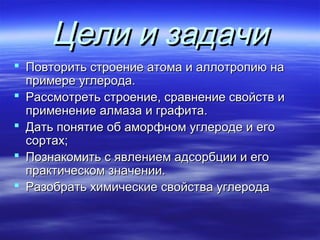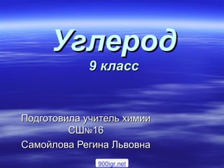 Документ представляет собой учебный материал для девятого класса по теме углерода, охватывающий строение атома, аллотропию и химические свойства углерода, а также применение алмаза и графита. Рассматриваются также аморфный углерод и явление адсорбции, его значение и применение. В конце представлены вопросы для закрепления материала.