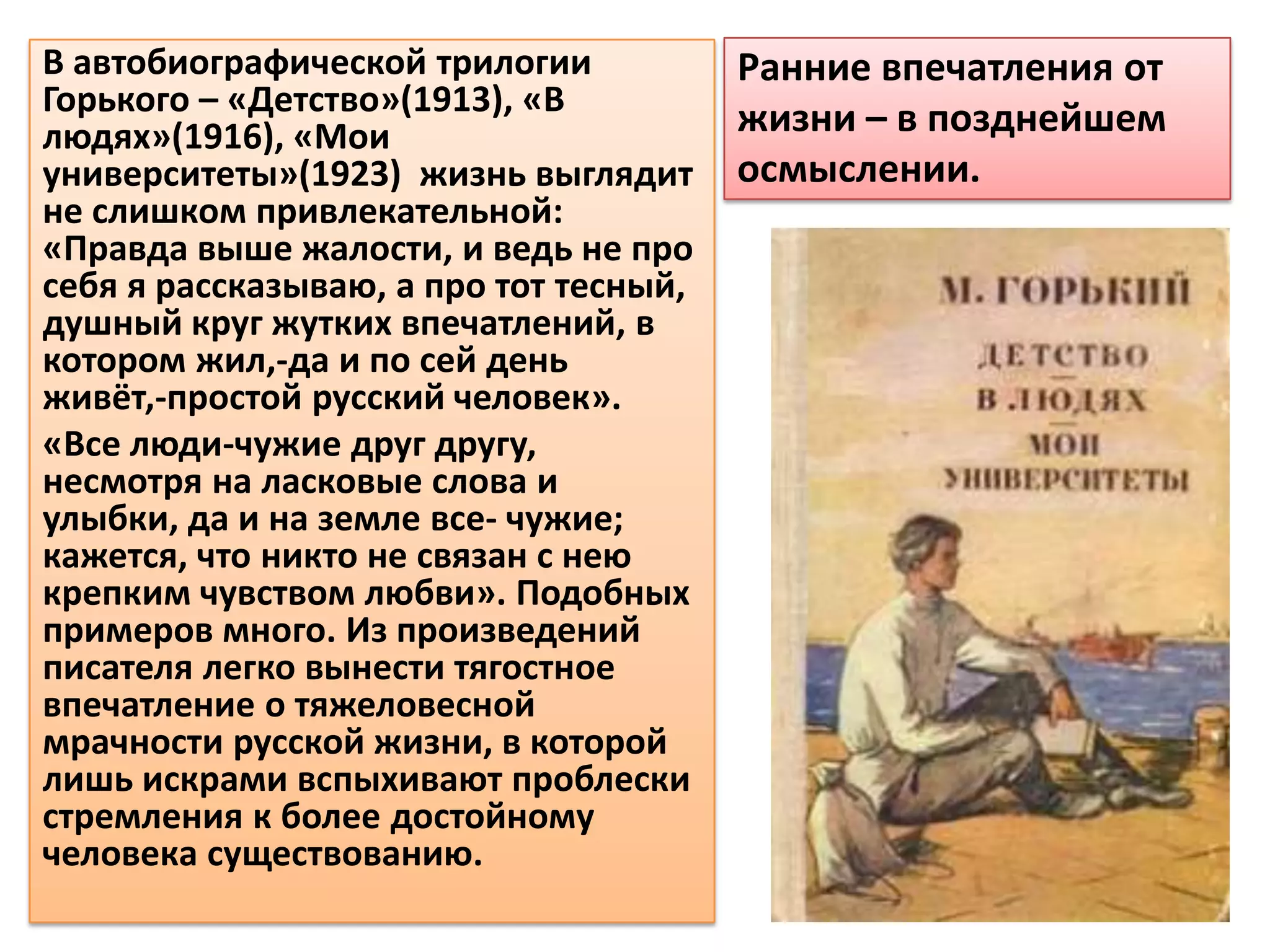 Документ представляет собой анализ автобиографической трилогии Алексея Максимовича Горького, в которой он отражает мрачные стороны русской жизни и тему борьбы. Горький исследует концепции веры и безверия, а также освобождение человека от религиозных иллюзий, подчеркивая значимость человеческого разума и творчества. В произведениях писателя заметно стремление к осмыслению жизни и ее страдания, что приводит к нигилизму и акценту на индивидуальной духовной борьбе.