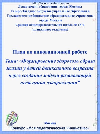 Документ представляет собой план инновационной работы образовательного учреждения по формированию здорового образа жизни у детей дошкольного возраста. В нем описаны направления работы, консультации, мероприятия и инициативы, направленные на оздоровление и развитие детей, а также вовлечение родителей и педагогов в этот процесс. Основное внимание уделяется здоровью как ценности, другим занятиям и играм, способствующим физическому и психологическому развитию.