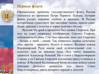 Документ охватывает историю государственного флага России от времен Петра I до современности, подчеркивая важные моменты его эволюции и изменения в символике. Рассказывается о различных флагах, использовавшихся в разные периоды, особое внимание уделяется бело-сине-красному триколору как государственному флагу. В конце документа указаны ритуалы и правила подъема и использования государственного флага в различных официальных контекстах.