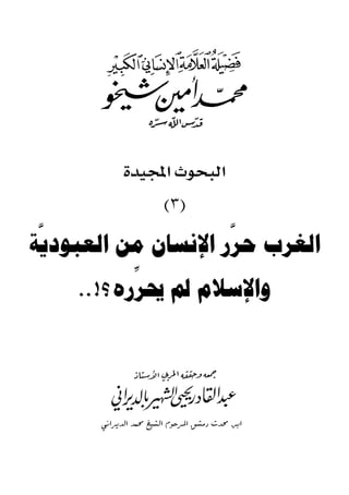 تتناول الوثيقة الفرق بين تحرير الإنسان من العبودية في الغرب وحرية الإنسان في الإسلام، حيث يُبرز الكاتب التوجه الإنساني والثقافي للإسلام في معالجة قضية الرق. تنتقد الوثيقة الفهم الغربي لحرية الإنسان وتظهر كيف يمكن للرق في السياق الإسلامي أن يتحول إلى وسيلة لهداية الإنسان وتحسين حالته. تُظهر الوثيقة أيضًا كيف أن التعاليم الإسلامية تسعى إلى إنقاذ الأرواح والنفوس وتقديم الرعاية الإنسانية، بدلاً من التعامل مع الأسير كعبيد.