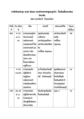 ของข้าราชการครูและลูกจ้าง โรงเรียนโคกกะเทียม วิทยาลัย ของ นางศิริพร มาวรรณา คาสั่ง วัน เดือน เรื่อง สถานที่ หน่วยงานที่จัด จานวน ที่ ปี (ชั่วโมง) - 9-1 0 การอบรมเชิง ณ โรงเรียนบ้านหมี่ ศูนย์พัฒนาการ 16 ก.ค.54 ปฏิบัติการ วิทยา อาเภอบ้าน เรียนการสอน ครูผู้สอน หมี่ จังหวัดลพบุรี โรงเรียนในฝัน คณิตศาสตร์ โรงเรียนดีประจา ระดับมัธยมศึกษา อาเภอศูนย์แม่ ตอนปลาย ข่ายจังหวัด ลพบุรี 1 34 29 การอบรมเชิง ห้องชมนาด สพม. 5 32 ส. ค. ปฏิบัติการการใช้ โรงเรียนพิบูล -1 เครือข่ายสังคม วิทยาลัย ก. ย. 54 ออนไลน์เพื่อการ จัดการเรียนการ สอน 1 85 18 โครงการอบรม อาคาร 1 0 ชั้น 3 มหาวิทยาลัย 8 พ. ย. วิจัยในชั้นเรียน มหาวิทยาลัยราช ราชภัฎเทพสตรี 54 ภัฎ เทพสตรี