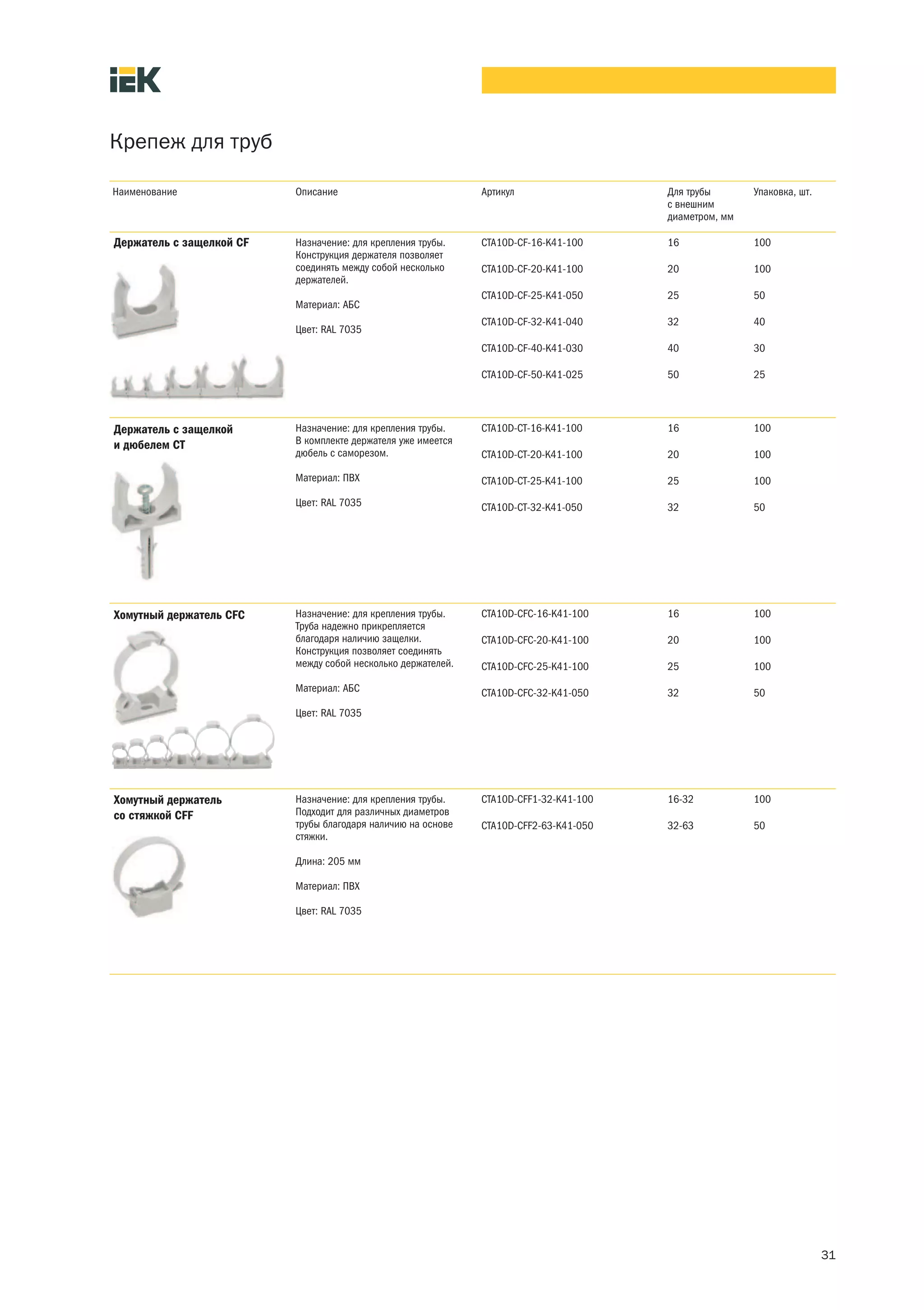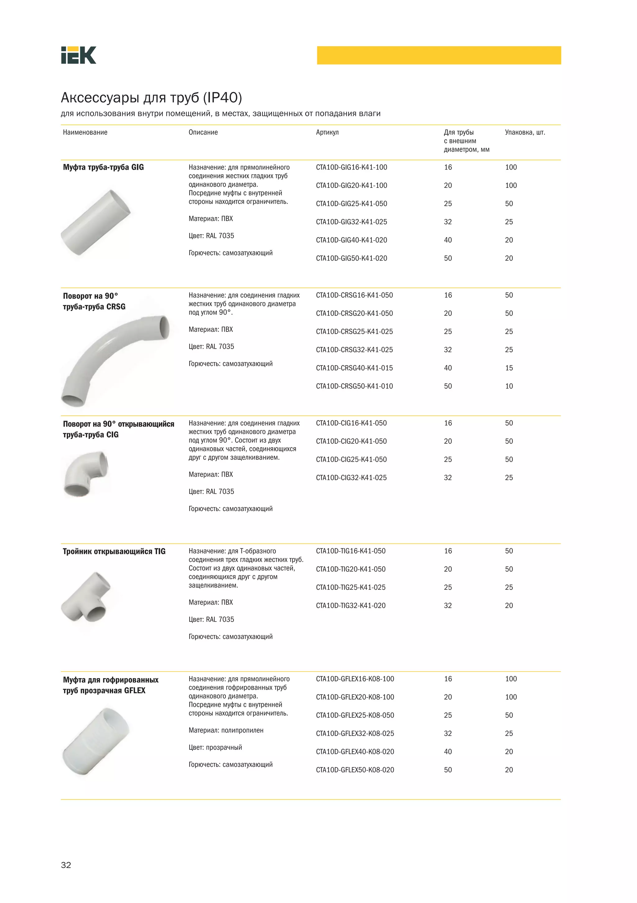 Документ содержит информацию о крепежах и аксессуарах для труб, включая их наименование, описание и артикулы для различных диаметров труб. Все элементы классифицированы по материалу, цвету и назначению, с акцентом на характеристиках защиты от влаги и пыли. Также представлена таблица выбора труб в зависимости от количества проводов и сечения, а также информация о степенях защиты IP.