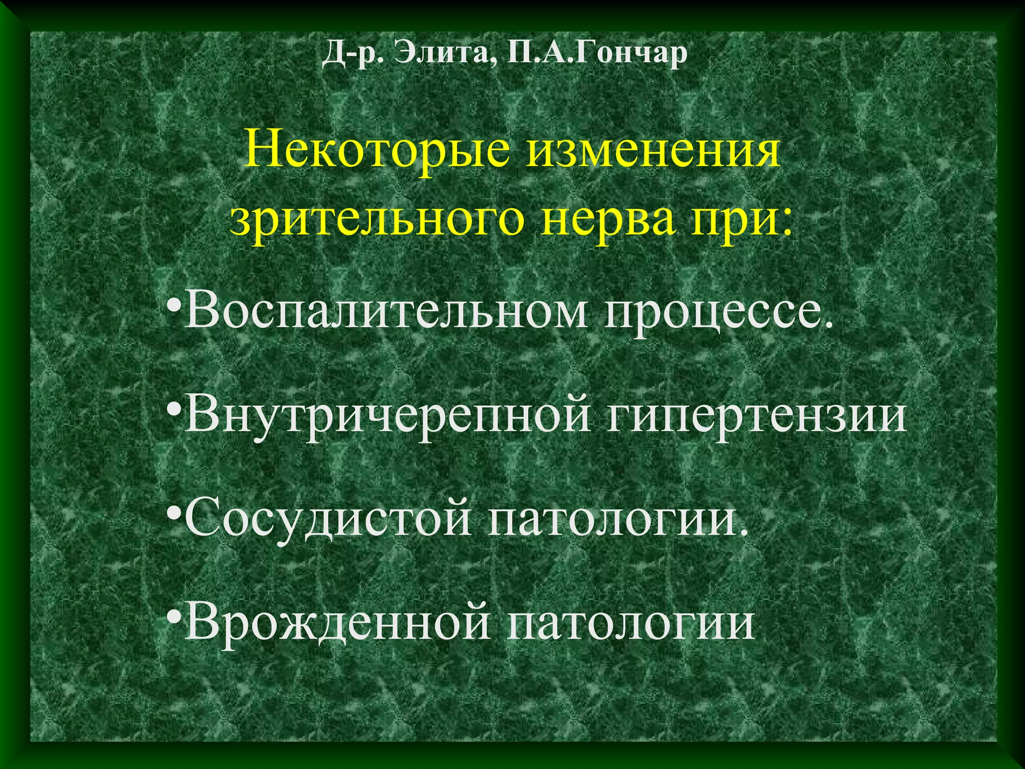 Документ описывает изменения зрительного нерва при различных патологиях, включая воспаление, гипертензию, сосудистые и врожденные нарушения. Приводятся клинические примеры, такие как болезнь глаз при гипертиреозе и передняя ишемическая оптикопатия с соответствующими визуальными и ангиографическими данными. В заключение подчеркивается необходимость оформления будущих выступлений в соответствии с представленным образцом.