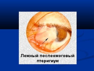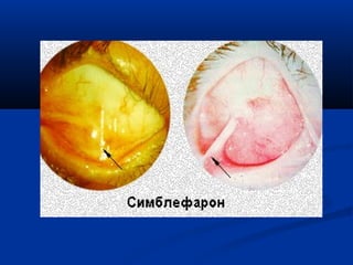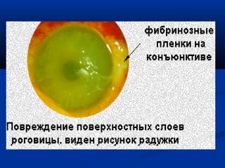 Документ описывает виды ожогов органа зрения, их проявления и классификацию по степени тяжести, а также возможные последствия и лечение. Приведен алгоритм первой помощи и рекомендации по терапии различных типов ожогов, включая химические, термические и механические. Изложены методы профилактики и лечения осложнений, необходимых для восстановления функции органа зрения.