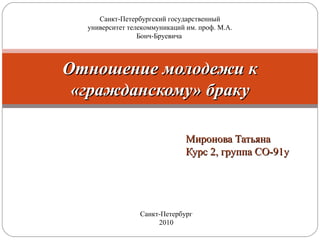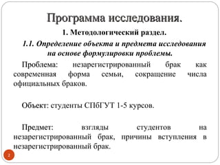 Исследование, проведенное студенткой Татьяной Мироновой, посвящено мнению молодых людей о незарегистрированных браках, а также факторам, влияющим на их выбор этой формы отношений. Основная цель работы заключается в выявлении отношения студентов СПбГТУ к незарегистрированным бракам и анализе влияния уровня образования и материального благосостояния на это отношение. Для достижения этой цели будет использован метод анкетирования с целью сбора мнений студентов относительно причин и норм незарегистрированного брака.