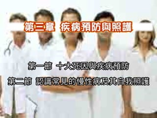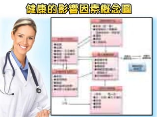 健康是生理、心理、社會、情緒和靈性等多方面的完整狀態。文中提到健康促進的定義,包括增強個體健康控制的過程,並強調健康行為的重要性,如均衡飲食和適度運動。最後,介紹了肥胖的評估方法及飲食應遵循的原則,如彩虹原則和根據季節調整飲食。