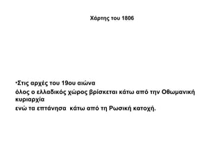 Στις αρχές του19ου αιώνα όλος ο ελλαδικός χώρος βρίσκεται κάτω από την Οθωμανική κυριαρχία ενώ τα επτάνησα κάτω από τη Ρωσική κατοχή. Χάρτης του 1806