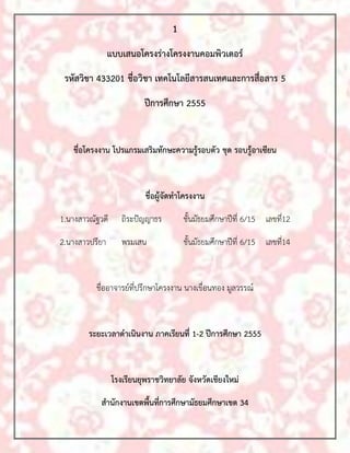 แบบเสนอโครงร่างโครงงานคอมพิวเตอร์ รหัสวิชา 433201 ชื่อวิชา เทคโนโลยีสารสนเทศและการสื่อสาร 5 ปีการศึกษา 2555 ชื่อโครงงาน โปรแกรมเสริมทักษะความรู้รอบตัว ชุด รอบรู้อาเซียน ชื่อผู้จัดทาโครงงาน 1.นางสาวณัฐวดี ถิระปัญญาธร ชั้นมัธยมศึกษาปีที่ 6/15 เลขที่12 2.นางสาวปรียา พรมเสน ชั้นมัธยมศึกษาปีที่ 6/15 เลขที่14 ชื่ออาจารย์ที่ปรึกษาโครงงาน นางเขื่อนทอง มูลวรรณ์ ระยะเวลาดาเนินงาน ภาคเรียนที่ 1-2 ปีการศึกษา 2555 โรงเรียนยุพราชวิทยาลัย จังหวัดเชียงใหม่ สานักงานเขตพื้นที่การศึกษามัธยมศึกษาเขต 34