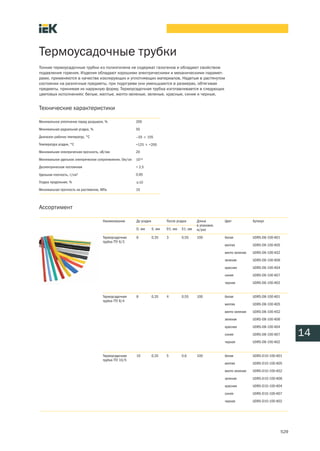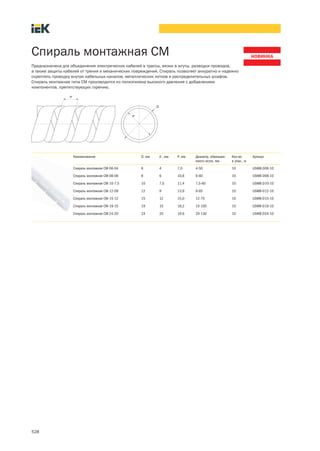 Спираль монтажная тип SM используется для объединения и защиты электрических кабелей, изготовленная из полиэтилена высокого давления с добавлением огнезащитных компонентов. Документ также описывает термоусадочные трубки, которые не содержат галогенов и имеют высокие электрические и механические характеристики, доступные в различных цветах и размерах. Указаны технические характеристики и ассортимент продукции.