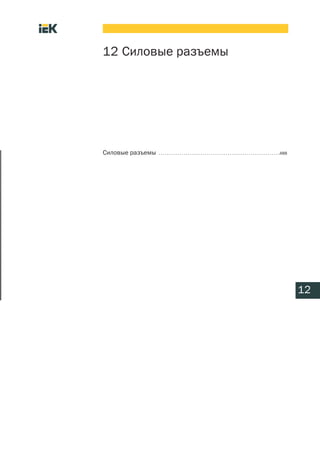 Документ описывает силовые разъемы и их применение, включая характеристики и преимущества для подключения электрооборудования в различных условиях. Приведены технические параметры, защитные степени и ассортимент разъемов с указанием номинальных токов и напряжений. Также включена информация о конструктивных особенностях разъемов, таких как материалы и защита от механических воздействий.
