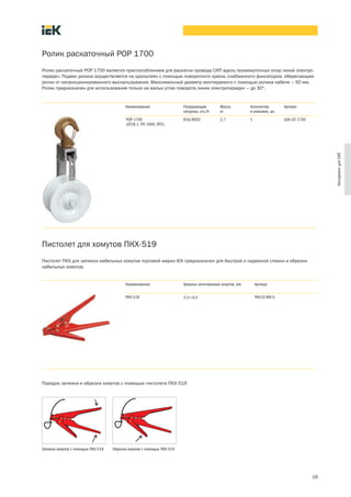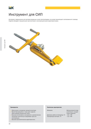 Документ описывает инструменты для монтажа воздушных линий электропередач на основе самонесущего изолированного провода, включая характеристики, преимущества и инструкции по использованию. Приведены подробные данные о различных инструментах, их функциях, технических спецификациях и способах их применения для обеспечения надежного и быстрого монтажа. Также представлены схемы и перечни необходимых материалов для установки узлов на основе провода СИП.