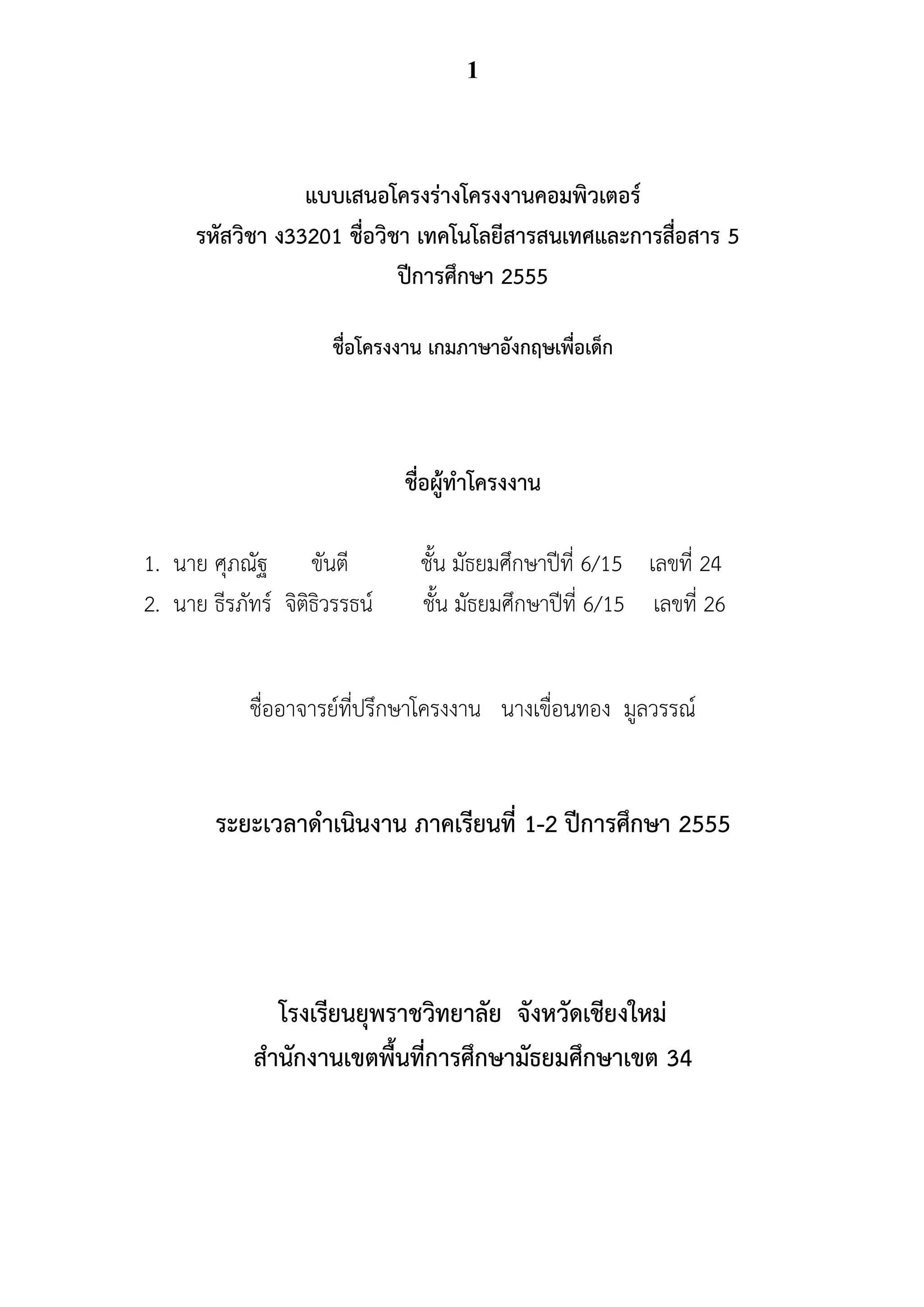 แบบเสนอโครงร่างโครงงานคอมพิวเตอร์ รหัสวิชา ง33201 ชื่อวิชา เทคโนโลยีสารสนเทศและการสื่อสาร 5 ปีการศึกษา 2555 ชื่อโครงงาน เกมภาษาอังกฤษเพื่อเด็ก ชื่อผู้ทาโครงงาน 1. นาย ศุภณัฐ ขันตี ชั้น มัธยมศึกษาปีที่ 6/15 เลขที่ 24 2. นาย ธีรภัทร์ จิติธิวรรธน์ ชั้น มัธยมศึกษาปีที่ 6/15 เลขที่ 26 ชื่ออาจารย์ที่ปรึกษาโครงงาน นางเขื่อนทอง มูลวรรณ์ ระยะเวลาดาเนินงาน ภาคเรียนที่ 1-2 ปีการศึกษา 2555 โรงเรียนยุพราชวิทยาลัย จังหวัดเชียงใหม่ สานักงานเขตพื้นที่การศึกษามัธยมศึกษาเขต 34