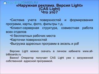 Документ описывает автоматизированную информационную систему наружной рекламы 'CAS Light', которая включает функции учета площадей и обработки коммерческих предложений с высоким уровнем интеграции между отделами. Система позволяет значительно повысить конкурентоспособность, производительность труда и управляемость рекламного бизнеса, а также предлагает автоматическую отправку адресных программ. Программа доступна для загрузки на сайте www.all-billboards.ru и поддерживается IT-службой в случае необходимости.