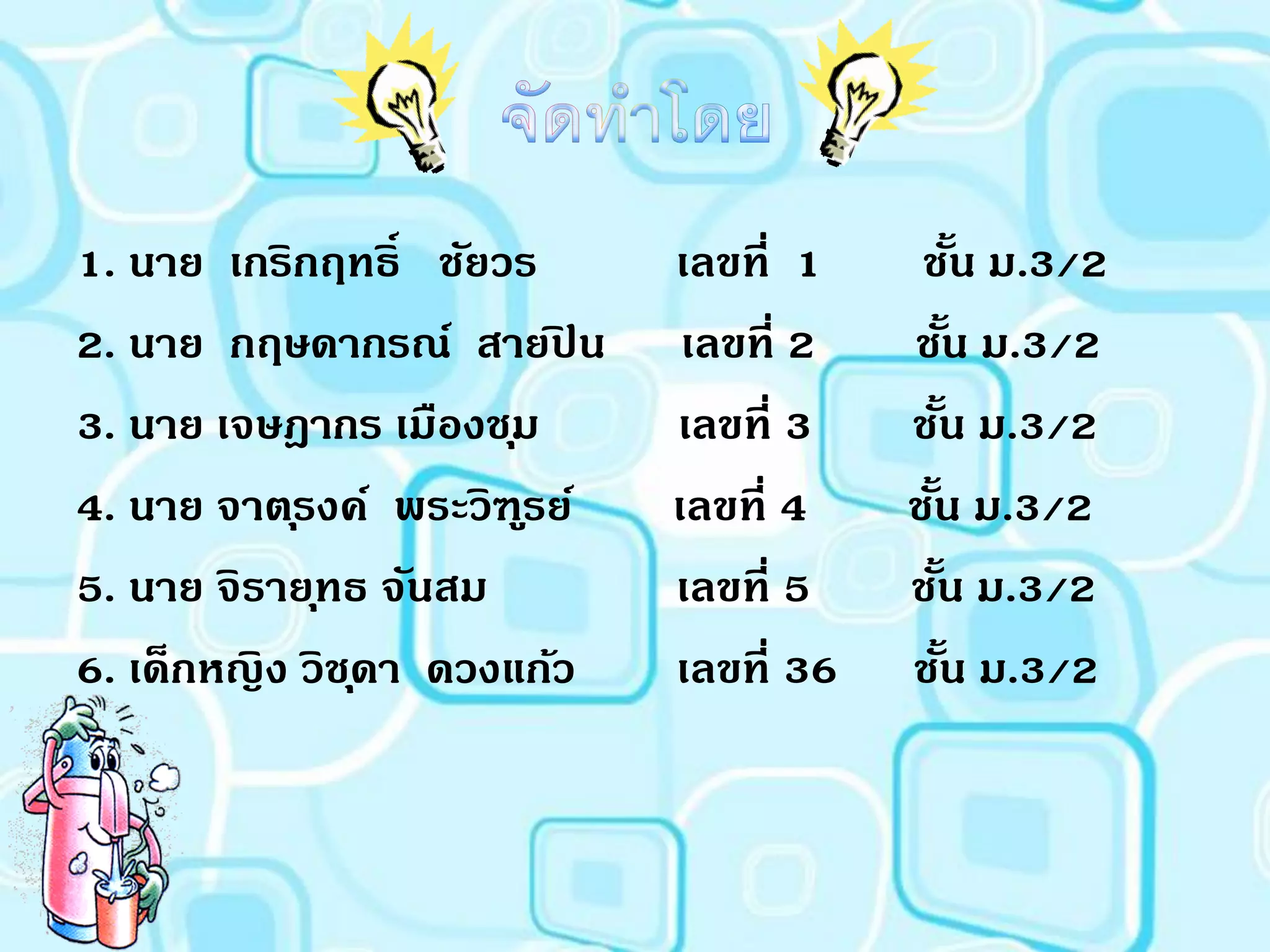 ชัยวร เลขที่ 1 ชัน ม.3/2 ้ 2. นาย กฤษดากรณ์ สายปน ิ เลขที่ 2 ชัน ม.3/2 ้ 3. นาย เจษฎากร เมืองช ุม เลขที่ 3 ชัน ม.3/2 ้ 4. นาย จาต ุรงค์ พระวิฑ ูรย์ เลขที่ 4 ชัน ม.3/2 ้ 5. นาย จิราย ุทธ จันสม เลขที่ 5 ชัน ม.3/2 ้ 6. เด็กหญิง วิช ุดา ดวงแก้ว เลขที่ 36 ชัน ม.3/2 ้