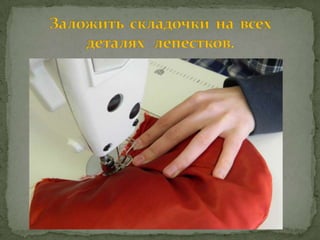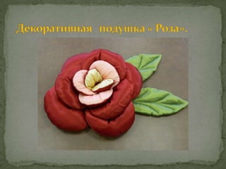 Документ содержит подробную инструкцию по изготовлению декоративной подушки в форме розы, выполненную Ириной Романова под руководством Натальи Викторовны Шумской. Описаны необходимые материалы, такие как ткани, синтепон и инструменты, а также последовательные шаги процесса пошива. Включены указания по количеству и типам лепестков, необходимых для создания розы.