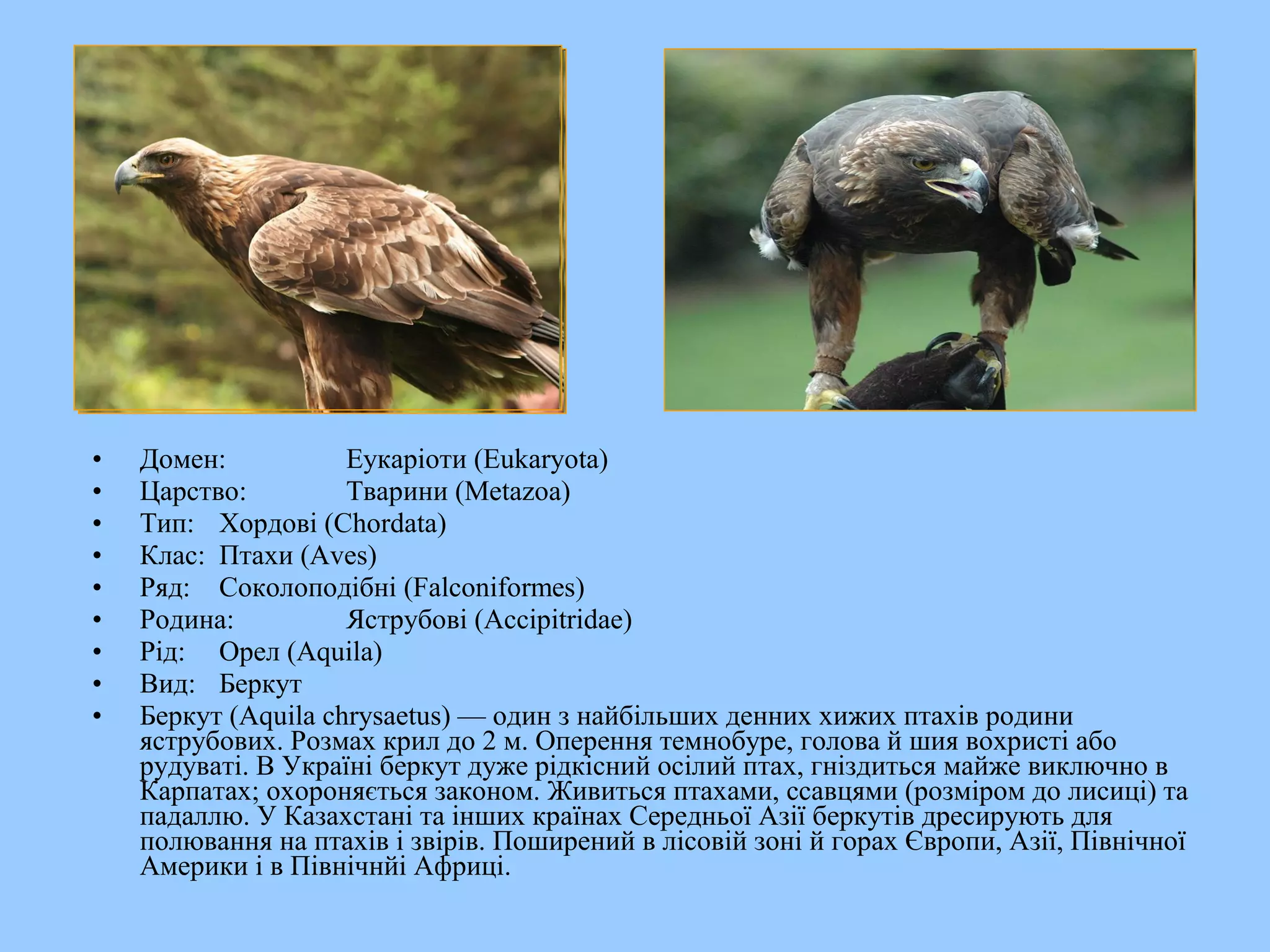 • Беркут (Aquila chrysaetus) — один з найбільших денних хижих птахів родини