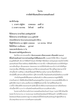 เทคโนโลยีสารสนเทศและการสื่อสาร 5 ปีการศึกษา 2555 ชื่อโครงงาน Cactus ดูดซับรังสี ชื่อผู้ทาโครงงาน 1. นางสาว ณัฐนิชา นวลละออง เลขที่ 13 ชั้น ม.613 2. นางสาว ธนวรรณ ไคร้วงษ์ เลขที่ 30 ชั้น ม.613 ชื่ออาจารย์ที่ปรึกษาโครงงาน นางเขื่อนทอง มูลวรรณ์ ระยะเวลาดาเนินงาน ภาคเรียนที่ 1-2 ปีการศึกษา 2555 โรงเรียนยุพราชวิทยาลัย จังหวัดเชียงใหม่ สานักงานเขตพื้นที่การศึกษามัธยมศึกษาเขต 34
