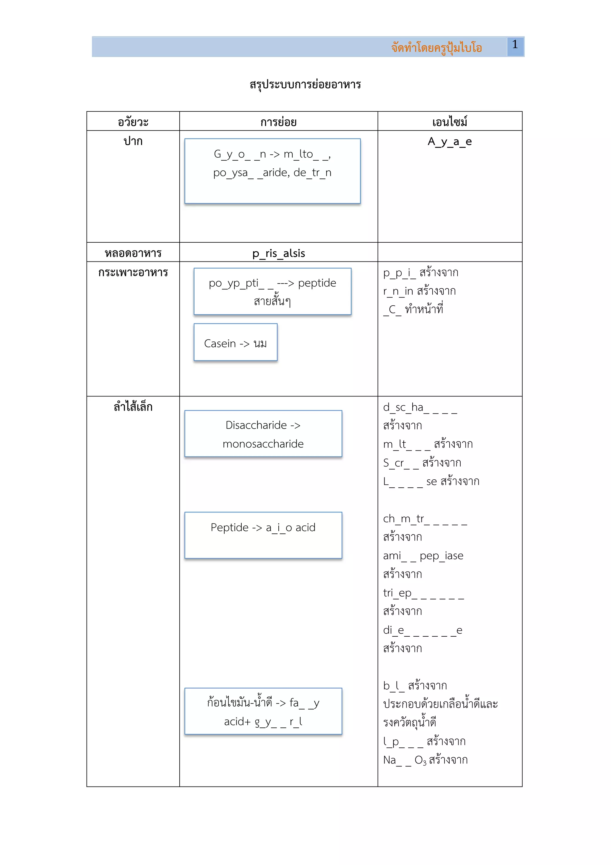 1 สรุประบบการยอยอาหาร อวัยวะ การยอย เอนไซม ปาก A_y_a_e G_y_o_ _n -> m_lto_ _, po_ysa_ _aride, de_tr_n หลอดอาหาร p_ris_alsis กระเพาะอาหาร p_p_i_ สรางจาก po_yp_pti_ _ ---> peptide r_n_in สรางจาก สายสั้นๆ _C_ ทําหนาที่ Casein -> นม ลําไสเล็ก d_sc_ha_ _ _ _ Disaccharide -> สรางจาก monosaccharide m_lt_ _ _ สรางจาก S_cr_ _ สรางจาก L_ _ _ _ se สรางจาก ch_m_tr_ _ _ _ _ Peptide -> a_i_o acid สรางจาก ami_ _ pep_iase สรางจาก tri_ep_ _ _ _ _ _ สรางจาก di_e_ _ _ _ _ _e สรางจาก b_l_ สรางจาก กอนไขมัน-น้ําดี -> fa_ _y ประกอบดวยเกลือน้ําดีและ acid+ g_y_ _ r_l รงควัตถุน้ําดี l_p_ _ _ สรางจาก Na_ _ O3 สรางจาก