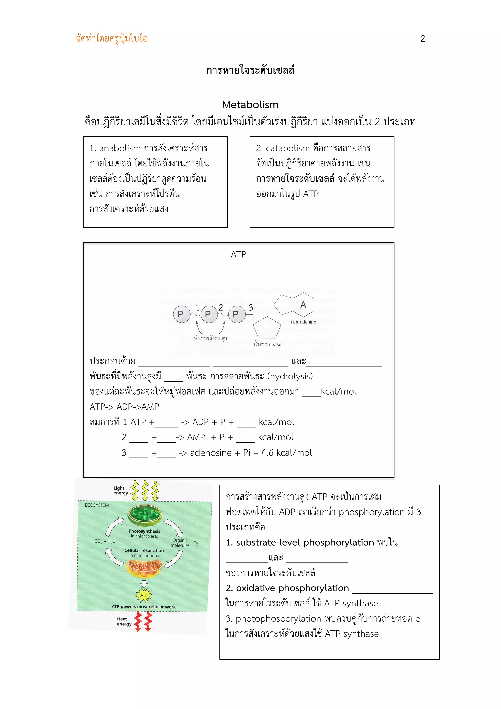 2 การหายใจระดับเซลล Metabolism คือปฎิกิริยาเคมีในสิ่งมีชีวิต โดยมีเอนไซมเปนตัวเรงปฏิกิริยา แบงออกเปน 2 ประเภท 1. anabolism การสังเคราะหสาร 2. catabolism คือการสลายสาร ภายในเซลล โดยใชพลังงานภายใน จัดเปนปฏิกิริยาคายพลังงาน เชน เซลลตองเปนปฏิริยาดูดความรอน การหายใจระดับเซลล จะไดพลังงาน เชน การสังเคราะหโปรตีน ออกมาในรูป ATP การสังเคราะหดวยแสง ATP 1 2 3 ประกอบดวย _______________ ________________ และ________________ พันธะที่มีพลังานสูงมี ____ พันธะ การสลายพันธะ (hydrolysis) ของแตละพันธะจะใหหมูฟอตเฟต และปลอยพลังงานออกมา ____kcal/mol ATP-> ADP->AMP สมการที่ 1 ATP +_____ -> ADP + Pi + ____ kcal/mol 2 ____ +____-> AMP + Pi + ____ kcal/mol 3 ____ +____ -> adenosine + Pi + 4.6 kcal/mol การสรางสารพลังงานสูง ATP จะเปนการเติม ฟอตเฟตใหกับ ADP เราเรียกวา phosphorylation มี 3 ประเภทคือ 1. substrate-level phosphorylation พบใน _________และ _____________ ของการหายใจระดับเซลล 2. oxidative phosphorylation _________________ ในการหายใจระดับเซลล ใช ATP synthase 3. photophosporylation พบควบคูกับการถายทอด e- ในการสังเคราะหดวยแสงใช ATP synthase