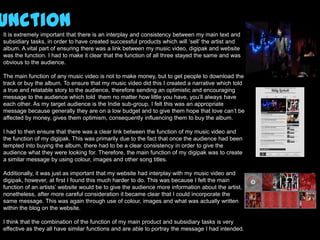 The combination of the main product (music video) and subsidiary tasks (digipak and website) is very effective due to consistency across color, lighting, camera angles, and framing. Red and blue are used throughout to represent the artist's British background and relatable love story. Low-key lighting creates mystery. Mid shots, close ups, and wide shots capture scenes and connect the products. Centering subjects focuses the audience. The products work together cohesively to promote the artist and sell the album.