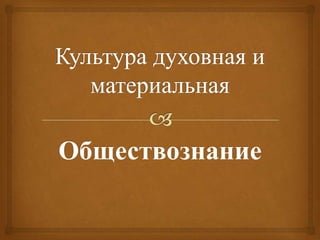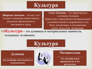 Документ обсуждает различные аспекты культуры, включая ее узкие и широкие значения, а также духовные и материальные ценности, созданные человеком. Он делит культуру на различные типы по способам самоорганизации и охвату, включая элитарную, народную, массовую и контркультуру. Также рассматриваются проблемы духовной культуры и вопросы, касающиеся истинности и значимости искусства.