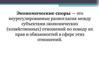 Документ описывает экономические споры как разногласия между участниками экономических отношений и классифицирует их на договорные, преддоговорные и внедоговорные. В нём подробно рассматриваются виды арбитражных процессуальных действий, стадии арбитражной процедуры и формы разрешения споров, включая судебные и неюрисдикционные методы, такие как посредничество и самозащита. Также обсуждается роль арбитражных судов в разрешении предпринимательских споров, их полномочия и порядок проведения различных типов судопроизводства.