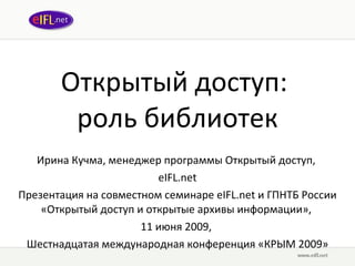Презентация Ирины Кучмы на семинаре посвящена роли библиотек в обеспечении открытого доступа к информации и знаниям. Основные темы включают стратегию открытого доступа, роль библиотек в поддержке научных публикаций и управление авторскими правами, а также меняющуюся среду для библиотек в условиях дигитализации. Документ выделяет вызовы и возможности для библиотек в современных условиях, включая новые услуги и партнерства с исследователями и образовательными организациями.